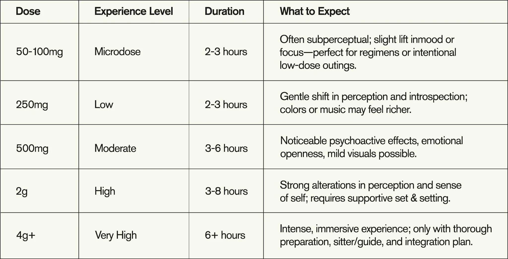 Below is a general guide to subjective effects at key dosage levels